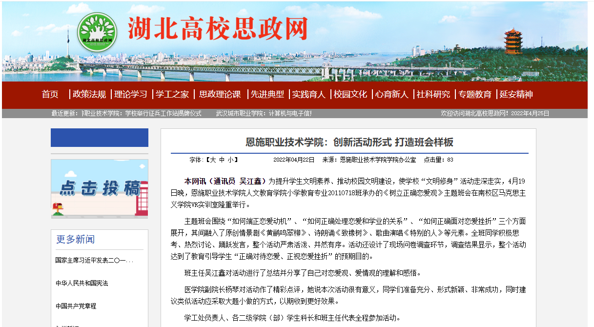 本网讯(通讯员 吴江鑫)为提升学生文明素养、推动校园文明建设,使学校“文明修身”活动走深走实,4月19日晚,恩施职业技术学院人文教育学院小学教育专业20110718班承办的《树立正确恋爱观》主题班会在南校区马克思主义学院VR实训室隆重举行。