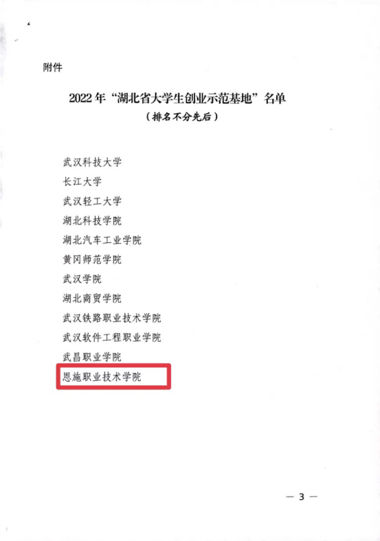 根据《关于开展2022年“湖北省大学生创业示范基地”申报工作的通知》(鄂教学办函[2022]4号)文件的要求,我校领导高度重视,积极开展申报、迎检工作。此次评选工作由湖北省教育厅与湖北省人力资源和社会保障厅共同开展,经高校申报、实地考察、专家评选等环节,认定恩施职业技术学院等12所高校大学生创业基地为2022年“湖北省大学生创业示范基地”。