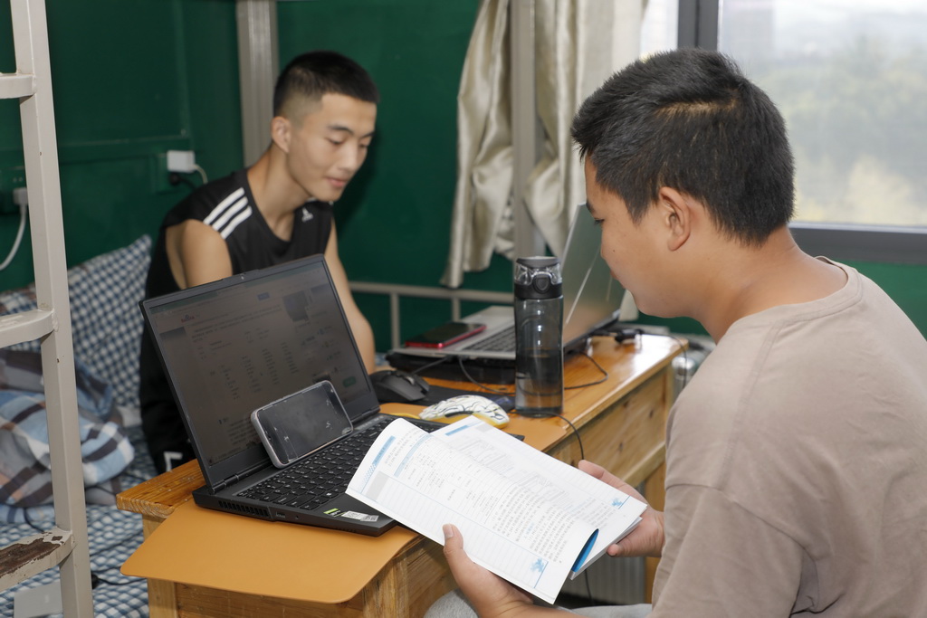 开学三日,我校“防疫不停教 停课不停学”,线上组织教学,同学们在寝室通过手机、电脑学习相关内容。